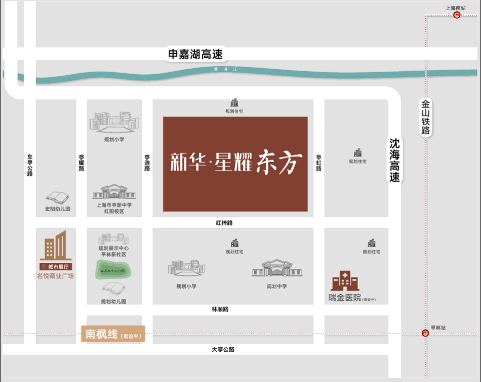 距离亭林医院约2公里,项目南侧有正在建设中的三甲级瑞金医院,金山院区一期项目,用地面积132亩,设置医疗床位400张,目前建设总投资约10.3亿元,南侧的体育公园配套设施也正在紧密的筹备中。